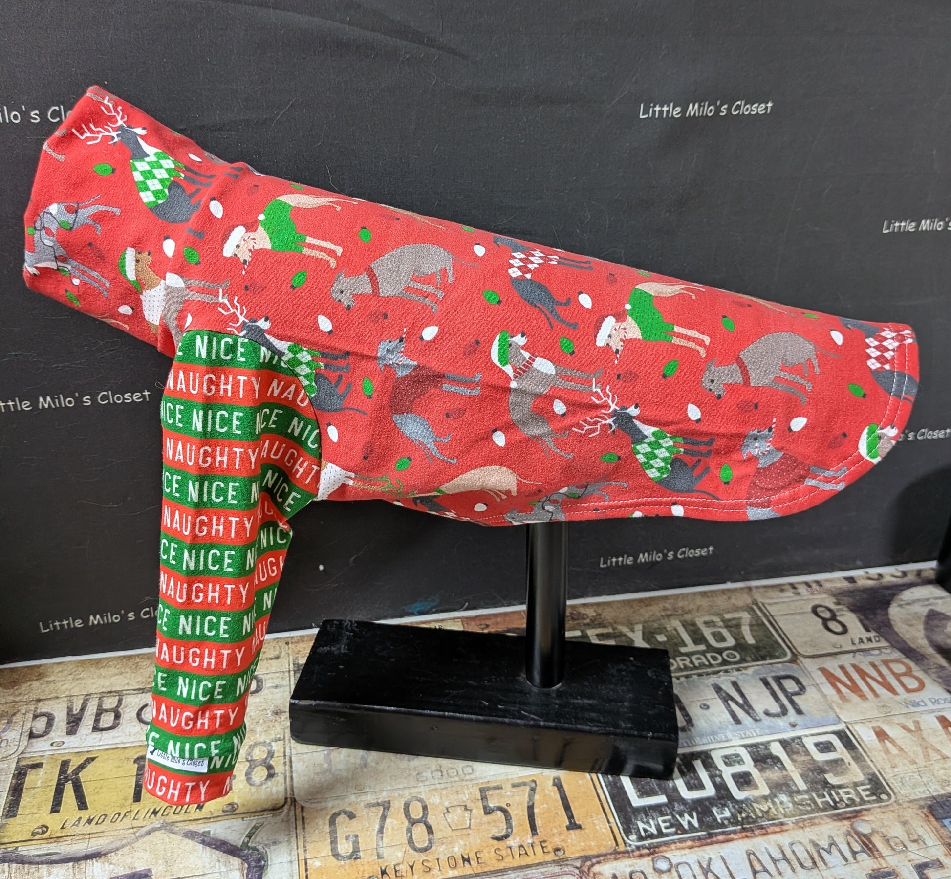 This adorable custom Italian Greyhounds with Naughty and Nice striped sleeves is perfect for the Holidays. Cotton Lycra fabric makes this a cozy addition. These have a cuff finishing on the sleeves and a soft collar to protect their necks. This is a custom printed fabric so only a limited supply is available.
