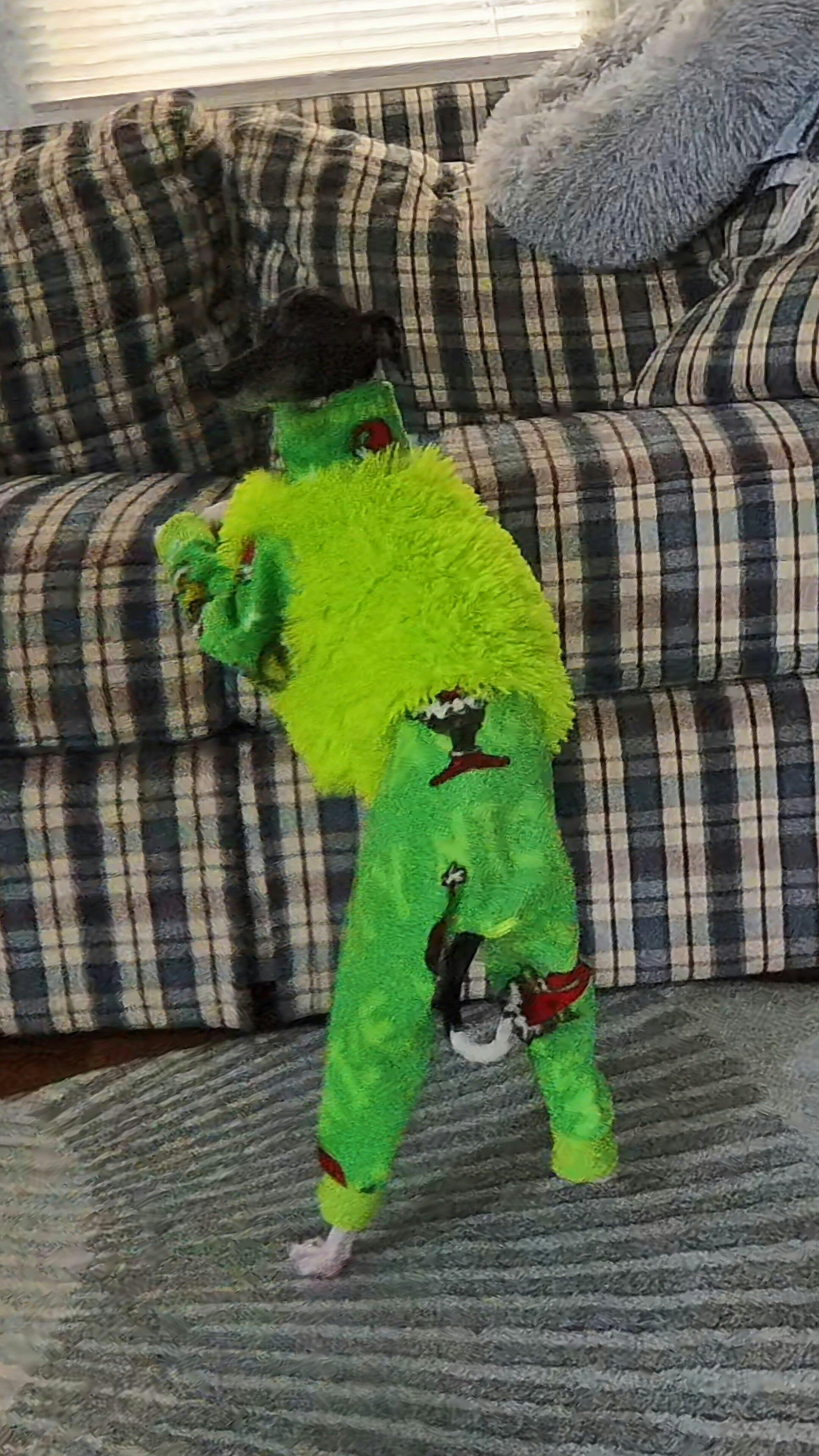The Grinch is back for a limited time. Bright Green fur on the body with an appearance by the Grinch on the legs, collar and cuffs with a soft anti-pill plush fleece. Collar and cuff snug around the neck and ankles. Item is custom fit to make it comfortable to wear